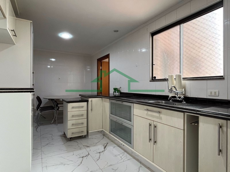 - Cozinha com armários, fogão e coifa