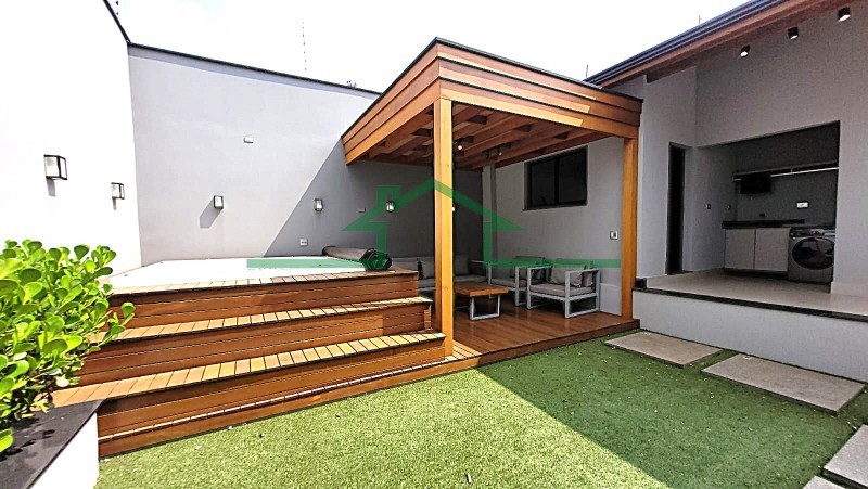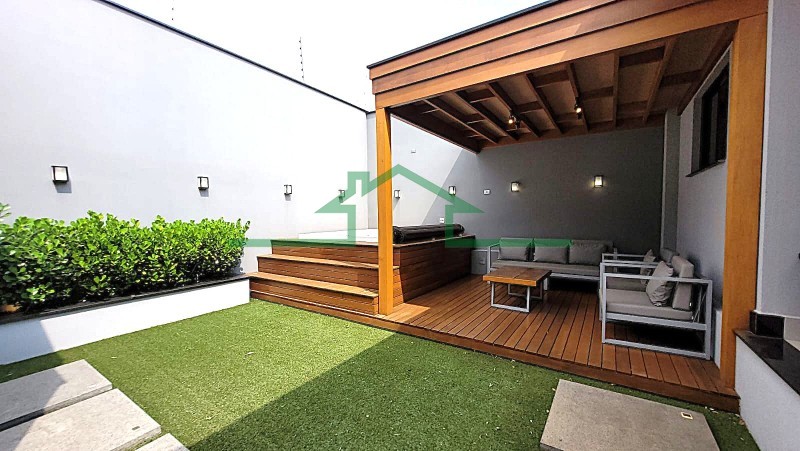 - Quintal com ofurô, deck de madeira, banheiro de apoio e quarto de despejo