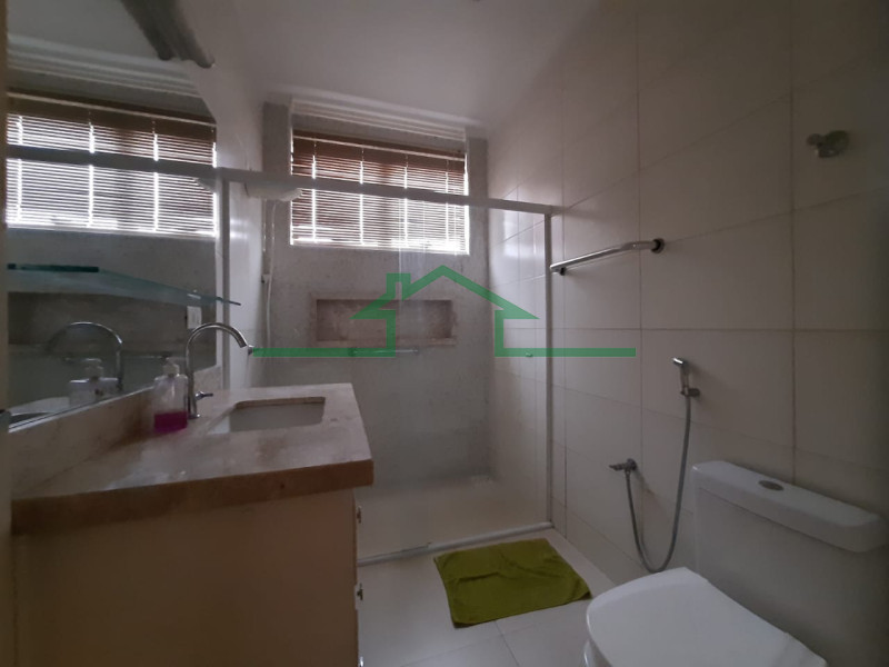 - Banheiro social reformado com gabinete, pia em mármore travertino e box blindex