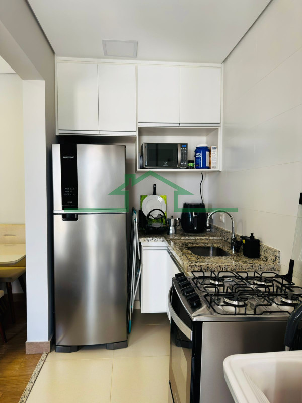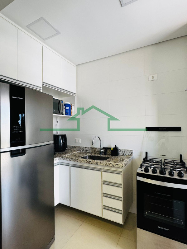 - Cozinha americana com armários, geladeira e fogão