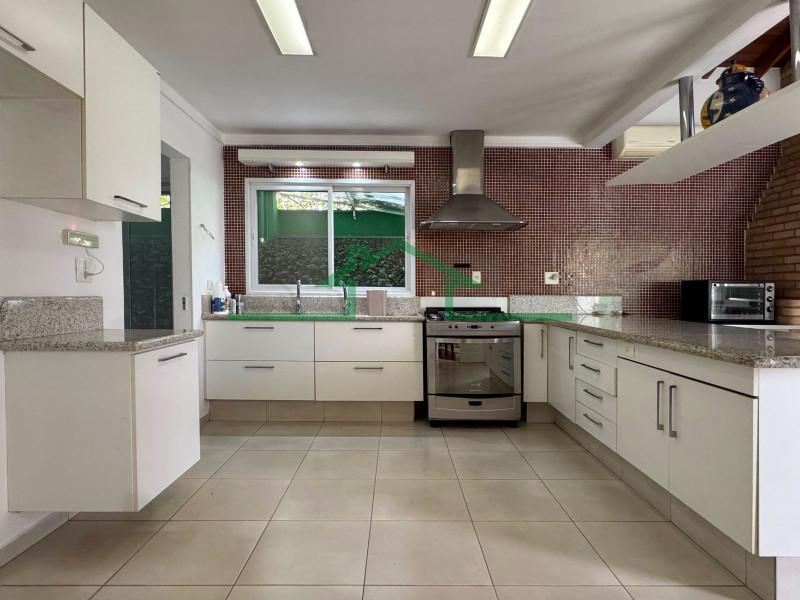 - Cozinha com armários planejados, fogão e coifa